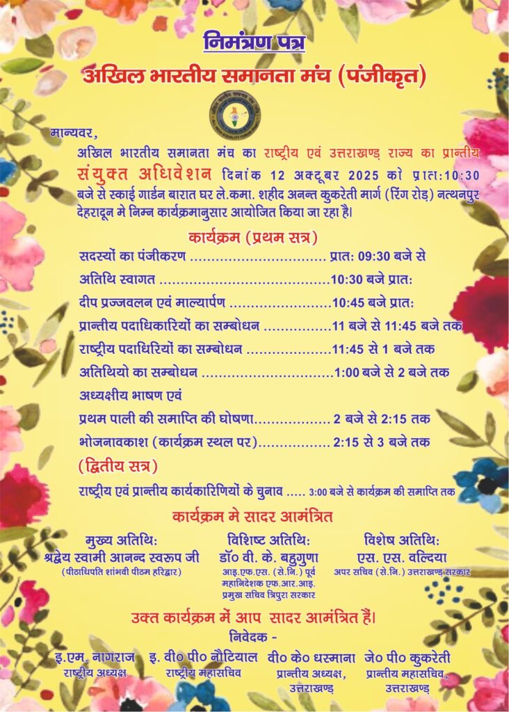 देहरादून अखिल भारतीय समानता मंच का राष्ट्रीय एवं प्रांतीय (उत्तराखंड) का संयुक्त अधिवेशन स्काई गार्डन बारात घर, ले0 कमां0 शहीद अनंत कुकरेती, नत्थनपुर, देहरादून में 12 अक्टूबर 2025 को आहूत किया गया है। इसमें उत्तराखंड राज्य के अतिरिक्त महाराष्ट्र, मध्य प्रदेश, कर्नाटक, तेलंगाना, दिल्ली, उत्तर प्रदेश, हरियाणा, हिमांचल एवं पंजाब से प्रतिनिधियों के भाग लेने की संभावना है। इं. एम नागराज राष्ट्रीय अध्यक्ष की अध्यक्षता में आयोजित अधिवेशन में बतौर मुख्य अतिथि शाम्भवी पीठम् हरिद्वार के पीठाधिपति स्वामी आनंद स्वरूप सम्मिलित होंगे। डॉ. वीके बहुगुणा से.नि. आई एफ एस पूर्व प्रमुख सचिव त्रिपुरा विशिष्ट अतिथि तथा श्री एस एस वल्दिया, पूर्व अपर सचिव, उत्तराखंड सरकार विशेष आमंत्रित अतिथि के रूप में सम्मिलित होंगे।
