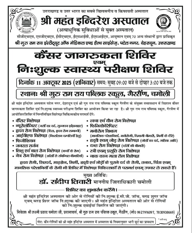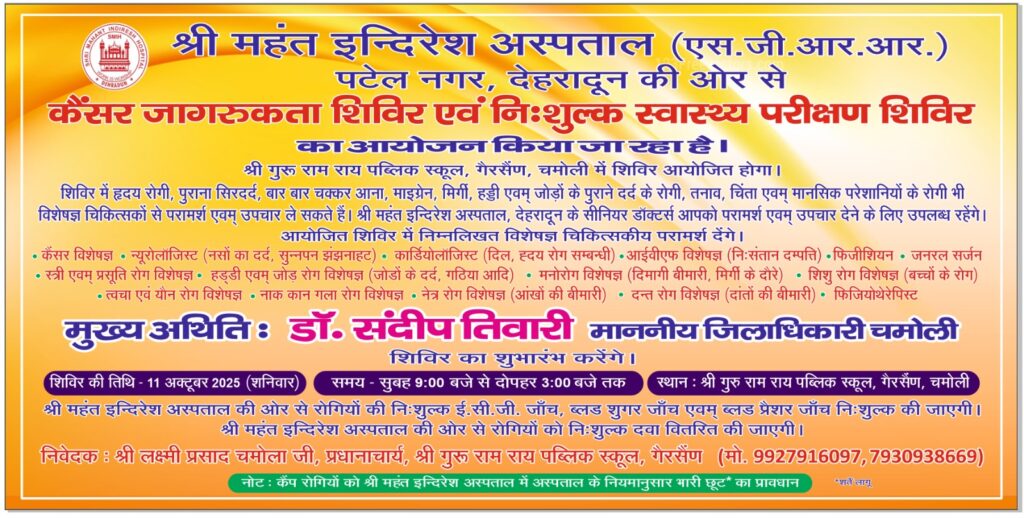 11 अक्टूबर को श्री महंत इन्दिरेश अस्पताल की और से श्री गुरु राम राय पब्लिक स्कूल, गैरसैंण, चमोली में आयोजित होने जा रहा कैंसर जागरूकता शिवि