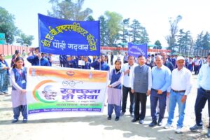 स्वच्छता ही सेवा पखवाड़े के अंतर्गत आज जनपद मुख्यालय पौड़ी में कंडोलिया मैदान से रामलीला मैदान तक स्वच्छता रैली का आयोजन उत्साहपूर्ण माहौल में किया गया। प्रातः 10 बजे कंडोलिया मैदान में स्कूली छात्र-छात्राओं, अधिकारी-कर्मचारियों एवं जनप्रतिनिधियों ने एक विशाल मानव श्रृंखला बनाकर स्वच्छता का संदेश दिया।