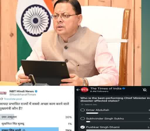 देश के आपदा प्रभावित राज्यों के मुख्यमंत्रियों के कामकाज पर आयोजित टाइम्स ग्रुप के सर्वे में उत्तराखंड के मुख्यमंत्री पुष्कर सिंह धामी ने शीर्ष स्थान हासिल किया है। देश के आपदा प्रभावित राज्यों के मुख्यमंत्रियों के प्रदर्शन को लेकर नवभारत टाइम्स ने हाल ही में एक ऑनलाइन सर्वे कराया। सवाल था “आपदा प्रभावित राज्यों में सबसे बेहतर काम करने वाले मुख्यमंत्री कौन हैं?” इस सर्वे में चार नाम शामिल थे उमर अब्दुल्ला, सुखविंदर सिंह सुक्खू, पुष्कर सिंह धामी और भगवंत मान।