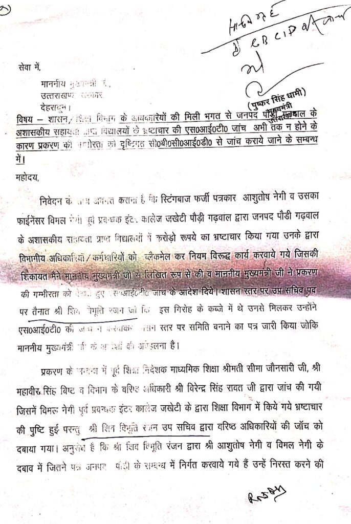 मामला पौड़ी जिले के अशासकीय विद्यालयों का है। अशासकीय विद्यालय इण्टर कालेज डांगीधार, इण्टर कालेज जखेटी में लिपिक पद पर अनियमितता कर मोटी रकम में लिपिकों की नियुक्ति की गई। इसके अलावा अशासकीय उच्चतर माध्यमिक विद्यालय कोटागढ़ में फर्जी जाति प्रमाण पत्र व इण्टर कालेज गढ़कोट मांडलू में जशोदा देवी की नियुक्ति पर राजेश सिंह राजा कोली ने सवाल उठाए। वर्ष 2022 में यह प्रकरण सामने आने के बाद आज तक मामले में कार्यवाही नहीं हुई। इसे लेकर राजेश सिंह राजा कोली मुख्यमंत्री के सामने उपस्थित हुए और मुख्यमंत्री धामी ने मामले की एसआईटी जांच के निर्देश दिए लेकिन विभाग के उप सचिव विभूति रंजन ने प्रबंधकों के हिसाब से इस मामले में समिति गठित कर दी। विभूति रंजन ने मुख्यमंत्री के आदेशों को रद्दी की टोकरी में डाल दिया और अपने अनुसार प्रबंधकों को फायदा पहुंचाने के लिए समिति गठित की। इस मामले में राजेश सिंह राजा कोली अभी कुछ दिन पहले ही सीएम धामी के सामने उपस्थिति हुए और विभूति रंजन पर भ्रष्टाचार का आरोप लगाते हुए पत्र सौंपा। मुख्यमंत्री ने अब विभूमि रंजन के साथ ही चारों स्कूलों की जांच सीबीसीआईडी सौंपने के आदेश दिए हैं और अब विेभूति इस आदेश को भी दबाने की फिराक में है। उप सचिव विभूति न सिर्फ इस मामले में बल्कि अन्य कई मामलों में संदेह के घेरे में है। सीबीसीआईडी जांच होती है तो विभूति सलाखों के पीछे होंगे।