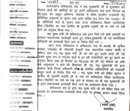 आज राज्य सचिवालय में सचिवालय संघ के अध्यक्ष श्री सुनील लखेड़ा, उपाध्यक्ष श्री जीतमणि पैन्यूली एवं महासचिव श्री राकेश जोशी द्वारा विभिन्न मांग पत्र माननीय मुख्यमंत्री जी को सौंपे गए तथा गोल्डन कार्ड संबंधी समस्याओं के साथ-साथ दिनांक 09 मई 2025 को की गई घोषणाओं के अनुपालन में विलंब की जानकारी दी गई।
