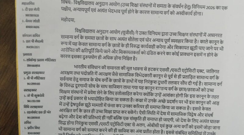 विश्वविद्यालय अनुदान आयोग द्वारा प्रस्तावित “उच्च शिक्षा संस्थानों में समता के संवर्धन हेतु विनियम, 2026” को लेकर विरोध तेज़ हो गया है। उत्तराखंड समानता पार्टी ने इसे एकपक्षीय, अन्यायपूर्ण और सामान्य वर्ग के विद्यार्थियों के प्रति भेदभावपूर्ण बताते हुए महामहिम राष्ट्रपति को संबोधित ज्ञापन जिलाधिकारी देहरादून के माध्यम से प्रेषित किया है।